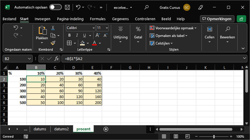 Of je zou al die tussenstapjes ook gewoon achterwege kunnen laten. Hier doe ik het in een keer. Kijk goed naar de formule in de formulebalk. Ik herhaal nog even de formule die hierboven ook al stond.